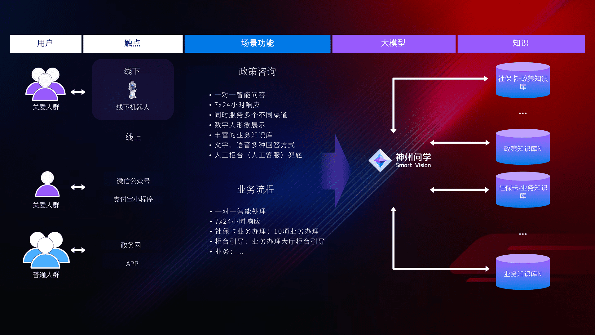 • 线上线下全覆盖:线上提供微信公众号、、、、支付宝小程序、、、、政务网、、、、app多种渠道,,,,与线下机器人形成完整服务体系。。。。